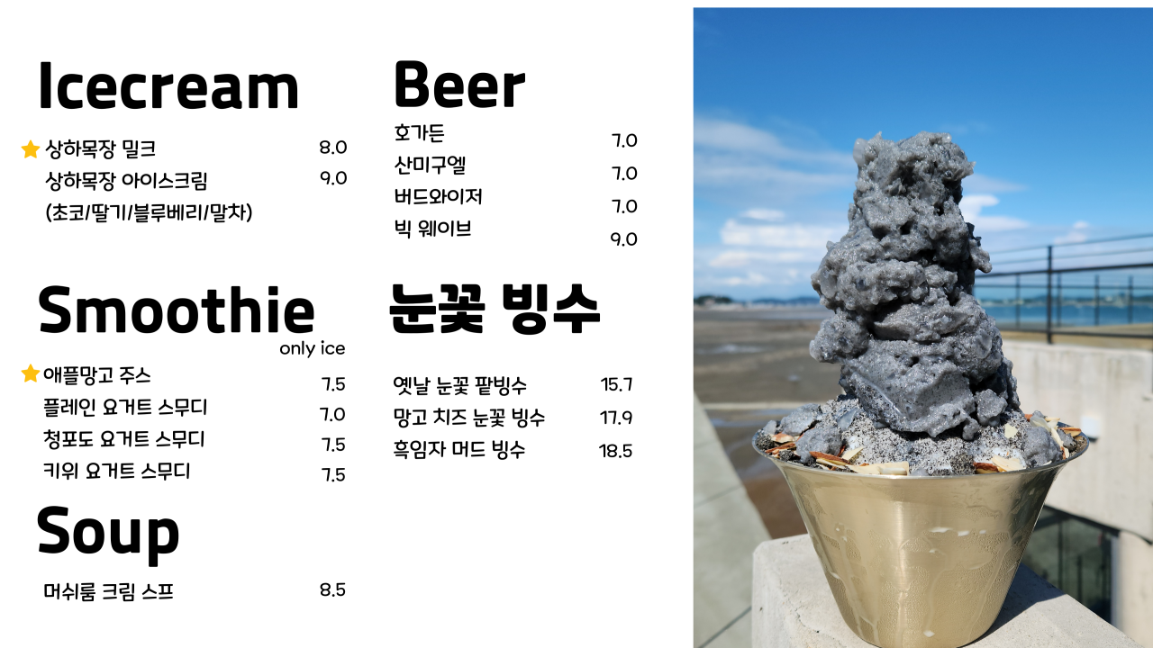 머드포레스트 카페에서는 다양한 메뉴를 통해 고객님들께 다채로운 경험을 제공합니다. 특히, 가또쇼콜라 파운드(6,000원)와 밤블랑(7,500원)은 많은 손님들로부터 높은 평가를 받고 있습니다. 이처럼 인기 있는 메뉴를 통해 영흥도 카페의 다양한 음료와 디저트를 즐겨보시는 것을 추천드립니다.
