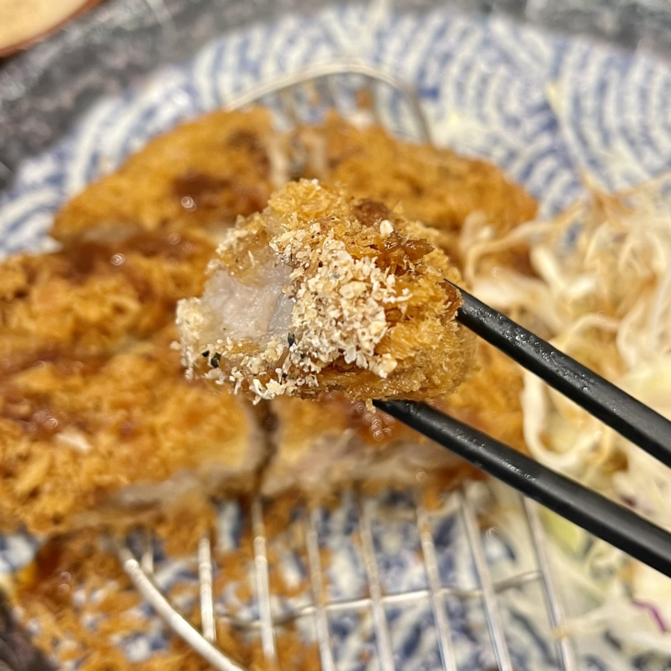 절구에 참깨를 빻아서 소스에 섞어 찍어먹으면 정말 고소하고 깊은 풍미가 느껴집니다. 이 작은 디테일 하나가 꼬숑돈까스를 더 기억에 남게 만들어 주더라고요.